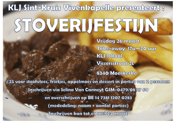De porties stoofvlees, frietjes, appelmoes en dessert verkopen we in porties van 2 personen voor slechts €25. Deze kunnen jullie dan komen afhalen in ons KLJ lokaal (vissersstraat 2c, 8340 Moerkerke) tussen 17u en 20u.Bestellen kan door een bericht te sturen/bellen naar Selina Van Canneyt (0479 08 27 60) en door over te schrijven op BE14 7381 1207 0283 met mededeling: naam + aantal porties. Inschrijven kan tot en met woensdag 24 maart. Bestel op tijd! (Er wordt geen cash ontvangen ter plaatse door de geldende maatregelen)